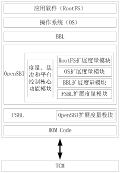Root of Trust (RoT) implementations for RISC-V processors provide the foundation for secure boot chains. These systems manage cryptographic keys used for verification of boot components and establish hardware-based trust anchors. The key management solutions include secure key storage, key rotation mechanisms, and protection against key extraction attacks, ensuring that the boot process begins with a trusted component that verifies subsequent stages.Expand Specific Solutions03 Attestation and Verification Mechanisms