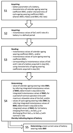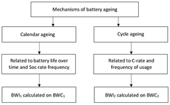 - A computer-implemented method that acquires and calculates battery parameters, including calendar and cycle ageing wearing coefficients, to determine instantaneous values of State of Charge (SoC) and charging/discharging rate (C-rate), and uses machine learning algorithms to update these coefficients based on historical data, providing a more accurate estimation of battery degradation.