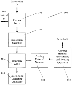 - The production of fine particles with a core and a coating of organic molecules using thermal plasma processes, which reduces agglomeration and oxidation, maintaining high surface energy and purity, and allowing for efficient dispersion without the need for dispersants.