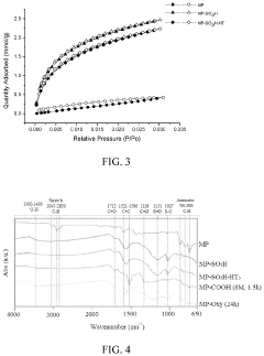 - A carbonaceous material with high surface coverage of acidic functional groups, specifically covalently linked to the edges of hexagonal carbon networks, enhancing hydrolytic efficiency and CO2 capture capabilities through modifications using sulfuric acid, nitric acid, or hypochlorite salt treatments, resulting in a nonporous structure with increased acid site density and specific surface area.