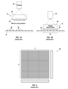 - A linear array of sensors with actively driven sensing electrodes and feedback circuits that maintain a fixed bias voltage, allowing for continuous scanning and improved sensitivity by minimizing the effect of parasitic capacitances, and enabling detection of defects like weak shorts and leaking transistors.