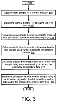 - A system utilizing distributed temperature sensors and thermal sources, coupled with a machine-learning model, to determine thermal property data of rock samples by analyzing temperature changes induced by controlled heat emissions, enabling precise characterization of thermal conductivity and geological properties.