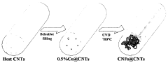- A method is developed to produce carbon nanotube encapsulated carbon nanofibers (CNFs@CNTs) through a three-step process involving functionalization of carbon nanotubes, deposition of catalytically active substances, and conversion of carbon-containing compounds using catalytic chemical vapor deposition, resulting in enhanced porosity and surface area.