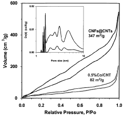 Strengths: Superior control over CNT morphology and structure, enabling tailored properties for specific energy storage requirements. Direct growth on current collectors eliminates interfacial resistance issues. Their scalable production methods address industrial implementation challenges. Weaknesses: The process requires precise control of multiple parameters, making it sensitive to environmental variations. Higher production costs compared to conventional carbon materials. Some techniques still require high temperatures, limiting substrate compatibility.