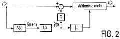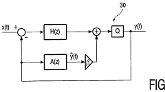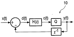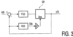 - The introduction of a noise-shaping device that utilizes a predictive filter and a weighting coefficient to produce an output signal based on both the input signal and a predictive signal, which represents future values of the output signal, allowing for a trade-off between bitstream compressibility and signal quality through a cost function that considers loopfilter and prediction filter outputs.