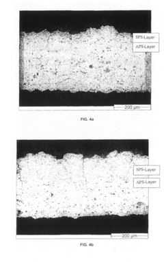 - Combining Atmospheric Plasma Spraying (APS) and Suspension Plasma Spraying (SPS) methods to create multi-layer thermal barrier coatings with improved microstructures and properties, such as increased porosity and reflectivity, reducing thermal conductivity and mechanical instability, while maintaining mechanical stability.