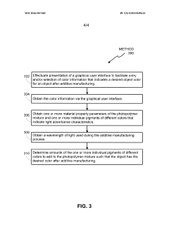 Color control in volumetric additive manufacturing can be achieved through sophisticated light-based techniques. These methods use specific wavelengths of light to selectively cure photopolymers containing various chromophores or color-changing compounds. By precisely controlling the intensity, duration, and spectral characteristics of the light source, manufacturers can induce different color formations within the printed object. This approach enables the creation of complex color patterns without requiring multiple material feedstocks.Expand Specific Solutions03 Real-time color monitoring and feedback systems