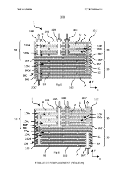 Technical Solution: Valeo has developed an innovative compact heat exchanger design specifically for electric vehicles that utilizes a stacked plate architecture with enhanced surface area. Their solution incorporates micro-channel technology with optimized flow distribution to maximize heat transfer efficiency while minimizing size and weight. The design features aluminum alloy construction with specialized coatings to prevent corrosion and enhance durability. Valeo's system integrates seamlessly with battery thermal management systems, utilizing a smart control algorithm that adapts cooling/heating capacity based on real-time battery temperature monitoring. Their design achieves approximately 30% higher heat transfer coefficient compared to conventional designs while reducing the overall volume by up to 25%. The system is particularly effective for fast-charging applications, where thermal management is critical for battery longevity and safety.