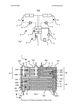 Technical Solution: Behr (now part of MAHLE) has pioneered a compact heat exchanger design for EVs featuring a layered multi-material approach that optimizes thermal conductivity while reducing weight. Their technology employs a combination of aluminum and polymer components in a brazed plate design that maximizes surface area contact while minimizing fluid volume requirements. The heat exchanger incorporates turbulence-enhancing microstructures that improve heat transfer coefficients by up to 40% compared to conventional designs. Behr's solution is particularly notable for its integration capabilities, designed to function simultaneously with multiple vehicle systems including battery cooling, cabin climate control, and power electronics thermal management. The design features modular construction that allows for customization based on specific vehicle platform requirements while maintaining manufacturing efficiency. Their latest generation achieves a 35% reduction in size compared to previous designs while handling the increased thermal loads of fast-charging EV batteries.