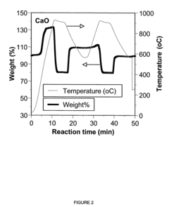 - A method using mesoporous calcium oxide (CaO) sorbents for carbonation and calcination reactions to separate CO2 from gas mixtures, maintaining high reactivity over multiple cycles and optimizing conditions to maximize carbonation extent even in the presence of SO2, integrated with hydrogen production processes for enhanced efficiency.