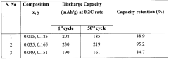 - A high voltage, high performance layered cathode material LiMxNyCo1-x-y02 is developed using a microwave method with dual dopants magnesium and copper, providing structural stability and enhanced conductivity, and paired with a micro-fiber textured carbon paper anode for improved cycling efficiency and discharge capacity.