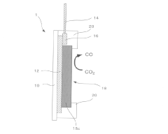 The composition of the electrolyte significantly impacts the efficiency, selectivity, and stability of CO2 electroreduction catalysts. Parameters such as pH, ionic strength, buffer capacity, and the presence of specific ions can alter reaction pathways and product distributions. Advanced electrolyte engineering approaches include the use of ionic liquids, organic additives, and local pH control strategies. Operating conditions such as temperature, pressure, and potential also play critical roles in determining catalyst performance and need to be optimized for specific catalyst systems.Expand Specific Solutions05 Stability enhancement strategies and degradation mechanisms
