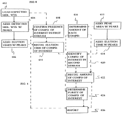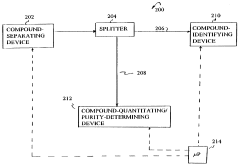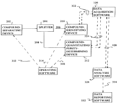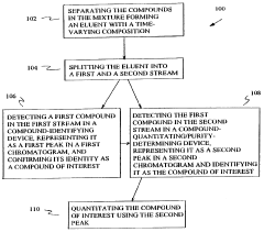 - A method and apparatus that utilizes chromatographic separation to split a product stream into two streams for simultaneous detection by a compound-identifying device (e.g., mass spectrograph) and a compound-quantitating/purity-determining device (e.g., evaporative light scattering detector), allowing for contemporaneous confirmation and quantitation of compounds, with peak correlation across devices to ensure accurate identification and purity determination.