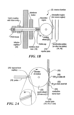 - A universal interface and sample load mechanism for continuous on-line liquid sample introduction into a time-of-flight mass spectrometer at subatmospheric pressure, using a rotating quartz wheel for sample deposition and desorption, allowing for high-throughput analysis with improved reproducibility and sensitivity.