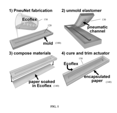 Research is advancing in developing biodegradable and environmentally friendly materials for soft pneumatic actuators. These include natural polymers, bioplastics, and other sustainable alternatives to traditional elastomers. Such materials address environmental concerns while maintaining the necessary mechanical properties for effective actuation, making them suitable for applications in environmental monitoring, agriculture, and biomedical fields.Expand Specific Solutions05 Manufacturing techniques for soft pneumatic actuator materials