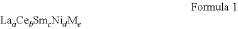 - Alloys with a specific elemental composition represented by LaaCebSmcNidMe, where M is Mn or Co, and specific atomic ratios of La, Ce, Sm, Ni, and M, which reduce hysteresis and enhance hydrogen storage capacity and desorption properties.