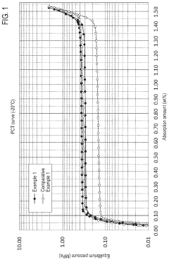 - Development of hydrogen storage materials with specific rare earth and transition metal compositions, such as LaNi5-based alloys, optimized for -20°C operation, featuring reduced hysteresis and stable hydrogen desorption with minimal pressure fluctuations, as represented by the elemental composition formula (M, a, b, c, d, e) ensuring large hydrogen storage and desorption capacity.