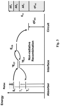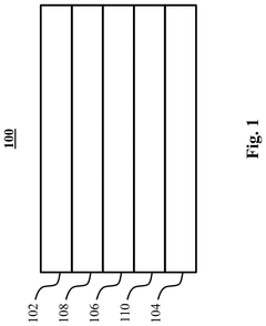 The architecture and fabrication methods of organic photovoltaic devices significantly impact their performance. Innovations include multi-junction structures, tandem cells, and inverted device configurations that enhance light harvesting and reduce recombination losses. Advanced manufacturing techniques such as solution processing, roll-to-roll printing, and controlled annealing processes can improve film morphology and interface quality, leading to higher efficiency and stability.Expand Specific Solutions03 Interface engineering and buffer layers