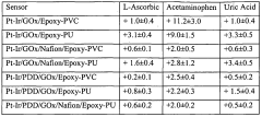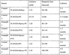 - An epoxy-enhanced polymer membrane is developed as a protective layer for biosensors, comprising a mixture of polymers and epoxy resin, which forms a durable coating that enhances adhesion to the enzyme layer and acts as a diffusion barrier, significantly extending the sensor's lifespan by preventing enzyme loss and membrane degradation.