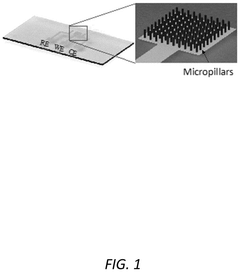 - A multiplexing and scalable electrochemical POC biosensing device is developed, utilizing micromolded electrodes in the form of arrays of micropillars, mounted on a printed circuit board (PCB), and incorporating a molded microfluidic portion for sample fluid flow, enabling rapid and quantitative detection of biomolecules.