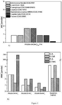 Chitosan-PEG hydrogels serve as effective drug delivery systems with inherent antimicrobial properties. These hydrogels can encapsulate various antimicrobial agents, providing controlled release over extended periods. The porous structure of the hydrogel allows for efficient drug loading while the chitosan component adds additional antimicrobial activity. These systems are particularly useful for wound dressings, implantable devices, and topical applications where sustained antimicrobial action is required. The PEG component improves drug stability and enhances the biocompatibility of the delivery system.Expand Specific Solutions03 Modification techniques for enhanced antimicrobial activity