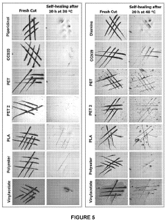 Materials with intrinsic self-healing capabilities rely on reversible chemical bonds or physical interactions that can reform after damage. These include materials with dynamic covalent bonds, hydrogen bonding networks, or supramolecular interactions. Intrinsic healing systems typically require external stimuli such as heat, pressure, or light to activate the healing process. The healing efficiency of these systems is often measured by recovery of mechanical properties, with some materials demonstrating near 100% recovery under optimal conditions.Expand Specific Solutions04 Healing efficiency measurement and quantification