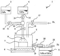 - A supported catalyst system using platinum and molybdenum carbide or tungsten carbide on a porous support, such as activated carbon or alumina, enhances the reaction rate and stability of hydrogenation and dehydrogenation reactions, allowing for efficient and long-term hydrogen storage and supply.
