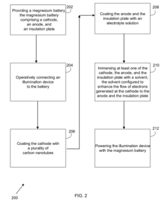 - A magnesium battery design featuring a cathode coated with hydrophilic carbon nanotubes, an anode configured to absorb electrons, and an insulation plate with conductive porous material, using an electrolyte solution of sea salt, glutamine sodium, and calcium carbonate to enhance ionization and inhibit corrosion, allowing the battery to power an illumination device through immersion in a solvent.