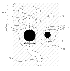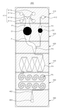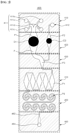 Technical Solution: Amorepacific has developed innovative microfluidic chip technology specifically for cosmetic efficacy and safety testing. Their "AmoreSkin-Chip" platform incorporates multi-layered microchannels that simulate the stratified structure of human skin, allowing for precise evaluation of ingredient penetration and distribution. The company's microfluidic systems feature specialized chambers that maintain viable skin cells for extended periods, enabling long-term exposure studies that better reflect real-world product usage. Amorepacific's chips integrate advanced imaging capabilities that provide real-time visualization of cellular responses to cosmetic ingredients, including inflammation markers, melanin production, and collagen synthesis. Their technology employs gradient generators to simultaneously test multiple concentrations of active ingredients, optimizing formulation efficiency. The company has also pioneered microfluidic models that incorporate Korean skin-specific characteristics, allowing for targeted product development for Asian markets. These systems have significantly reduced Amorepacific's reliance on animal testing while providing more physiologically relevant data for cosmetic development.