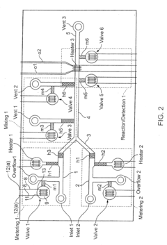 Innovative valve designs specifically developed for microfluidic applications, including pneumatic valves, hydraulic valves, and electrically actuated systems. These valves enable precise control of fluid routing, mixing, and compartmentalization within microfluidic chips. The technologies incorporate materials and actuation mechanisms that function reliably at the microscale, with minimal dead volume and rapid response times. Advanced designs include multiplexed valve arrays for complex fluid handling operations and programmable flow control.Expand Specific Solutions04 Droplet-based microfluidic control systems