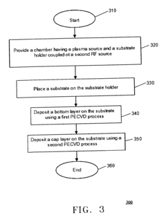 Technical Solution: Applied Materials has developed advanced plasma-enhanced chemical vapor deposition (PECVD) systems that operate at lower temperatures (200-400°C) compared to thermal CVD (>800°C). Their Producer® platform incorporates multi-station sequential deposition technology with independent plasma sources for each chamber, enabling precise control over film properties. The company's PECVD technology utilizes radio frequency (RF) power to create reactive plasma that allows deposition of high-quality silicon nitride, silicon oxide, and amorphous silicon films at significantly lower temperatures than thermal processes. Their dual-frequency PECVD capability enables independent control of ion energy and plasma density, resulting in films with tailored stress characteristics and improved step coverage[1]. Applied Materials has also pioneered high-density plasma CVD (HDP-CVD) systems that combine physical sputtering with chemical deposition for superior gap-filling performance in high-aspect-ratio structures, critical for advanced semiconductor manufacturing nodes[3].