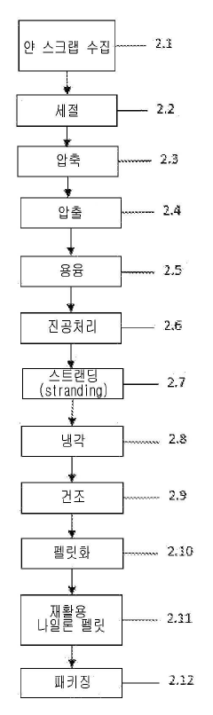 - Recycled nylon 6.6 pellets are produced from tire-grade nylon 6.6 yarn scrap, and blended with virgin pellets to create tire-grade yarn with comparable properties through a solid state polymerization process, minimizing finishing oil levels and ensuring homogeneous mixing.