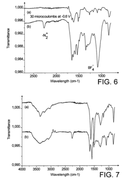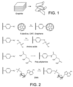 - A process involving a reactive surface with radical and/or ionic species is used to assemble with a coating surface or molecule of interest, forming covalent bonds through non-electrochemical conditions, allowing for the immobilization of various materials and molecules, including graphene and carbon nanotubes, using adhesion primers that form radicals or ions, such as diazonium salts, to achieve strong and controlled adhesion.