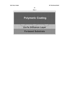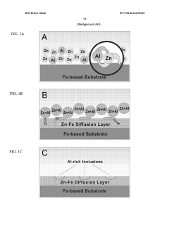 Various post-processing treatments can be applied to zinc coatings to enhance their properties. These include chromate conversion coatings, phosphating, passivation treatments, and organic topcoats. Such treatments improve corrosion resistance, adhesion for subsequent painting, and aesthetic appearance. Post-processing can also include heat treatments to modify the microstructure of the zinc coating or to promote specific zinc-iron alloy formation, thereby enhancing durability and performance in aggressive environments.Expand Specific Solutions05 Corrosion resistance mechanisms and testing of zinc coatings