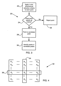 - A method that applies multiple one-dimensional peak selection criteria to each point in an n-dimensional data set, with candidate peaks identified as exceeding multiple thresholds, and further refined through peak recognition algorithms to select actual peaks, effectively handling noisy and non-normally distributed data.