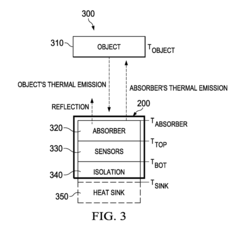 - 03 Comparative performance analysis between thermopile and pyroelectric technologiesThermopile and pyroelectric detectors exhibit distinct performance characteristics suited for different applications. Thermopiles offer continuous DC response, higher temperature stability, and better performance in steady-state measurements, while pyroelectric detectors excel in detecting rapid temperature changes with higher sensitivity but require signal chopping for DC measurements. The selection between these technologies depends on specific application requirements including response time, operating temperature range, power consumption, and signal processing complexity. Hybrid approaches combining both technologies can leverage their complementary strengths for enhanced detection capabilities.Expand Specific Solutions