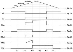Technical Solution: STMicroelectronics has pioneered several innovative Schmitt trigger implementations, particularly in their ultra-low-power microcontroller and analog product lines. Their BCD (Bipolar-CMOS-DMOS) technology platform enables unique Schmitt trigger designs that combine the advantages of multiple process technologies. ST's approach features programmable hysteresis circuits that can be dynamically adjusted through digital control interfaces, allowing software-configurable noise immunity levels. Their latest designs incorporate sub-1V operation capability while maintaining hysteresis ratios of up to 30% of VDD. ST has developed specialized radiation-hardened Schmitt trigger variants for aerospace applications, featuring triple-redundant voting circuits and SEU (Single Event Upset) immunity up to 60 MeV·cm²/mg. Their automotive-qualified Schmitt triggers implement proprietary temperature compensation techniques that maintain consistent threshold voltages (±2% variation) across the full automotive temperature range.