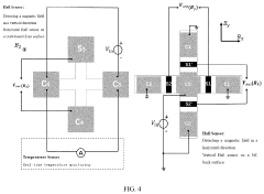 Temperature compensation mechanisms are integrated into Hall effect sensors to maintain stable performance across varying thermal conditions. These include specialized circuit designs, material selection for reduced temperature drift, and calibration techniques. By minimizing the effects of temperature variations on sensor output, these approaches ensure consistent measurement accuracy and reliability in applications exposed to fluctuating environmental temperatures, extending the operational range of the sensors.Expand Specific Solutions03 Integration and miniaturization of Hall effect sensors