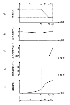 - The engine control method adjusts the air-fuel ratio to be leaner than stoichiometric across all load ranges, reduces the compression ratio at higher loads, retards the ignition timing, and uses supercharging to manage intake air, ensuring the excess air ratio is maintained at λ=2 or more, particularly λ=3 for optimal efficiency.