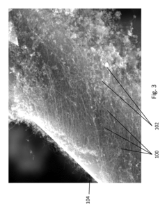 Technical Solution: Rice University has pioneered groundbreaking research in carbon nanotube structural applications, particularly through their Carbon Hub initiative. Their technical approach focuses on the synthesis of ultra-long carbon nanotubes (reaching lengths of several centimeters) that demonstrate superior load transfer capabilities compared to metal powders in composite materials. Rice's researchers have developed proprietary chemical vapor deposition methods that produce nanotubes with 98% fewer structural defects than conventional methods, resulting in composites with tensile strengths exceeding 2 GPa - approximately 3-4 times stronger than comparable metal powder composites. Their technology incorporates specialized functionalization techniques that enhance interfacial bonding between nanotubes and matrix materials, addressing a key limitation in nanotube-based structural applications.