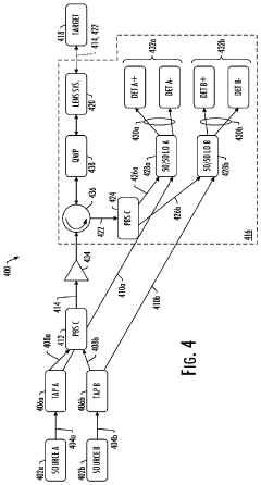 Technical Solution: IMEC has developed a silicon photonics-based optical phased array platform for LiDAR applications that integrates thousands of phase shifters on a single chip. Their approach utilizes a proprietary silicon nitride (SiN) waveguide technology that offers lower optical loss compared to traditional silicon photonics, enabling longer detection ranges. IMEC's OPA design incorporates thermo-optic phase shifters arranged in a two-dimensional array configuration, allowing for beam steering in both azimuth and elevation without mechanical components. The system achieves a field of view of approximately 80 degrees horizontally and 20 degrees vertically with steering speeds in the microsecond range. A key innovation in IMEC's approach is their advanced calibration algorithms that compensate for manufacturing variations in the phase shifters, resulting in more precise beam control. The platform operates at the 905nm wavelength band, balancing performance with cost considerations for automotive applications. IMEC has also explored hybrid integration approaches that combine their silicon photonics platform with III-V materials to enhance light emission and detection capabilities.