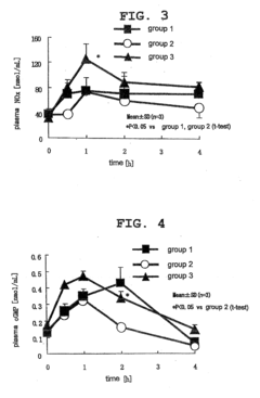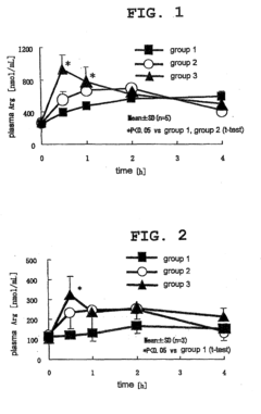 Technical Solution: The Cleveland Clinic Foundation has developed comprehensive research protocols comparing trimethylglycine (TMG) and arginine for nitric oxide production. Their approach involves clinical studies measuring plasma nitric oxide levels after supplementation with either compound. Their research demonstrates that while arginine directly serves as a substrate for nitric oxide synthase (NOS), TMG works through an indirect pathway by donating methyl groups that help recycle homocysteine to methionine, ultimately supporting nitric oxide production through improved endothelial function. The Cleveland Clinic's studies have shown that arginine supplementation provides more immediate increases in nitric oxide levels, while TMG offers more sustained benefits with fewer side effects such as gastrointestinal distress.