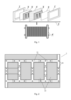 - Novel materials and manufacturing techniques for efficiency improvement: Innovative materials and manufacturing techniques have been developed to enhance the efficiency of both battery types. For Iron-Air batteries, nano-structured iron compounds and advanced catalysts improve reaction kinetics and reduce overpotential. In Vanadium Redox Flow batteries, novel electrode materials with optimized porosity and surface chemistry enhance electron transfer and reduce internal resistance. Advanced manufacturing techniques, including 3D printing and precision coating methods, enable more precise control over component structures, leading to improved performance and efficiency in both battery technologies.