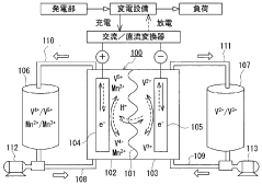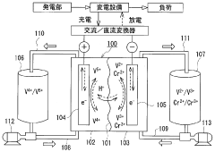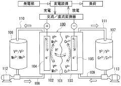 Technical Solution: Sumitomo Electric has developed advanced Vanadium Redox Flow Battery technology through years of research and commercial deployments. Their VRFB system utilizes high-purity vanadium electrolyte with proprietary additives that enhance stability and performance across wider temperature ranges. Sumitomo's cell stack design features specialized ion-exchange membranes manufactured in-house, providing excellent ion selectivity while minimizing crossover contamination. Their integrated system architecture includes sophisticated electrolyte management with thermal regulation that maintains optimal operating conditions, resulting in consistent performance regardless of ambient conditions. Sumitomo's commercial VRFB installations demonstrate round-trip efficiencies of 70-80%, with minimal capacity degradation over 20+ years of projected operation. Their largest installations exceed 60MWh capacity, proving the scalability of their technology for grid-scale applications. The company's manufacturing capabilities enable production of standardized modular units that can be rapidly deployed and easily expanded as energy needs grow.