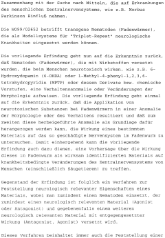 - A method using nematodes, specifically Caenorhabditis elegans, to assess neurologically relevant properties of materials by exposing them to neurotoxic substances and observing changes, allowing for the determination of a material's potential to influence the central nervous system, including the reversal or prevention of neurotoxic-induced abnormalities.