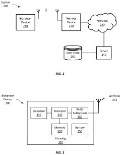 Power consumption is a critical performance metric for wearable biosensors, directly impacting usability and adoption. Metrics include battery life under various usage scenarios, power consumption rates during active sensing versus standby modes, and energy efficiency of data processing algorithms. Advanced power management techniques such as adaptive sampling rates and selective sensor activation help optimize battery performance while maintaining data quality and sensor functionality.Expand Specific Solutions03 Data processing and analytics performance