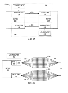 Hybrid interfaces bridge quantum systems with photonic networks, allowing for the conversion between stationary qubits and flying qubits. These interfaces enable the transfer of quantum information between different physical implementations of quantum bits, such as from superconducting qubits to optical photons. The technology incorporates electro-optical modulators, frequency converters, and quantum transducers to facilitate efficient quantum state transfer across different platforms. These hybrid systems are crucial for building heterogeneous quantum networks.Expand Specific Solutions04 Optical interconnect technologies for high-speed data transmission