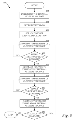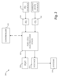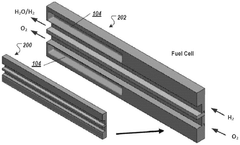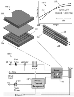 Technical Solution: Topsoe has developed a proprietary thermal management system for SOECs called eCOs™, which incorporates advanced ceramic materials with tailored thermal expansion coefficients to minimize thermal stress during operation. Their system features a unique stack design with integrated thermal monitoring sensors that provide real-time temperature distribution data across the cell. Topsoe's approach includes specialized edge sealing technology that prevents thermal leakage while maintaining electrical isolation between cells. Their thermal management solution incorporates dynamic load response capabilities, allowing the system to adjust operational parameters based on thermal conditions to prevent hotspot formation. Topsoe has demonstrated stable operation under thermal cycling conditions with degradation rates below 0.5% per 1000 hours, significantly outperforming conventional designs. Their technology also includes specialized gas distribution channels that ensure uniform temperature profiles even at high current densities.