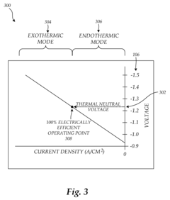 Technical Solution: CEA has developed advanced thermal management solutions for solid oxide electrolysis cells (SOECs) focusing on optimized heat distribution through innovative cell architecture. Their approach incorporates specialized thermal barrier coatings and structured flow channels that enable precise temperature control across the cell surface. CEA's thermal management system utilizes a combination of active and passive cooling strategies, including integrated heat exchangers that recover waste heat to improve overall system efficiency. Their research has demonstrated that proper thermal gradient management can extend SOEC lifetime by up to 40% while maintaining high hydrogen production rates. CEA has also pioneered computational fluid dynamics modeling specifically tailored for SOEC thermal behavior prediction, allowing for rapid design iterations and performance optimization before physical prototyping.