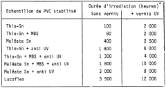 Various bio-based additives can be incorporated into PVC formulations to enhance UV stability. These natural compounds, derived from renewable resources, act as UV absorbers or radical scavengers, protecting the polymer matrix from photodegradation. The additives can include plant extracts, lignin derivatives, and other bio-based compounds that effectively absorb harmful UV radiation or neutralize free radicals formed during UV exposure, thereby extending the service life of PVC products while reducing environmental impact.- Bio-based additives for PVC UV stabilization: Various bio-based additives can be incorporated into PVC formulations to enhance UV stability. These natural compounds, derived from renewable resources, can act as effective UV absorbers or radical scavengers, protecting the polymer from photodegradation. The incorporation of these bio-based additives not only improves the UV stability of PVC but also reduces the environmental impact compared to traditional petroleum-based stabilizers.